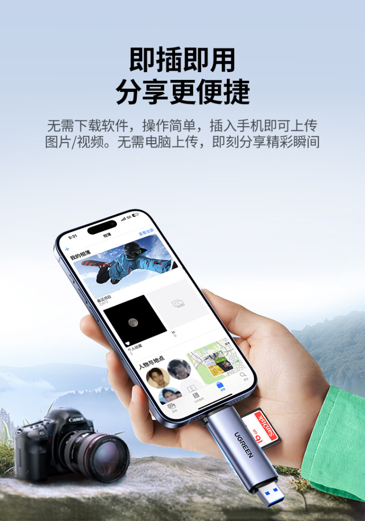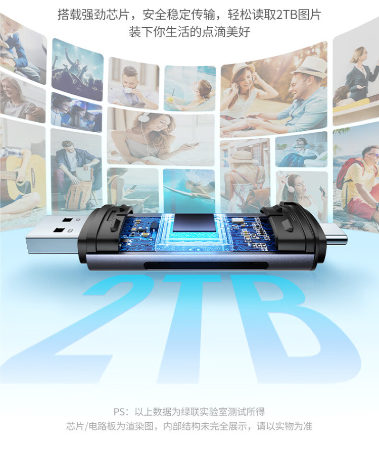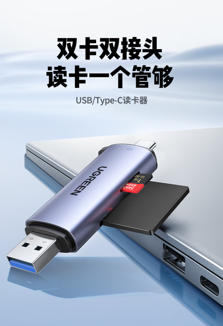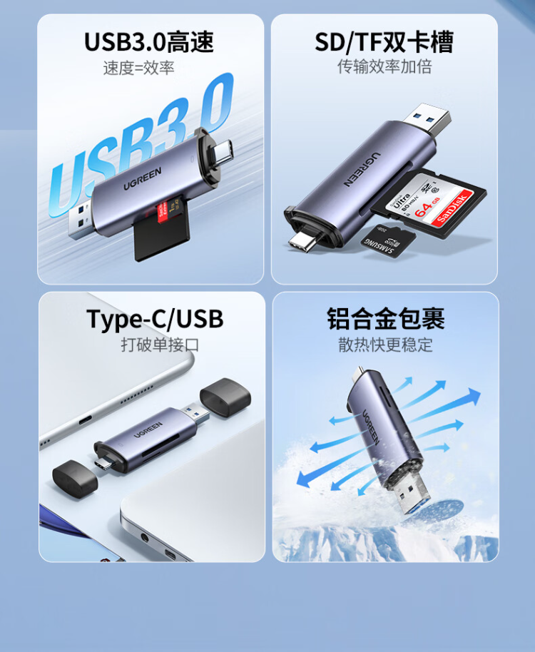 绿联 CM185-50705 USB/Type-C 3.0高速读卡器 SD/TF